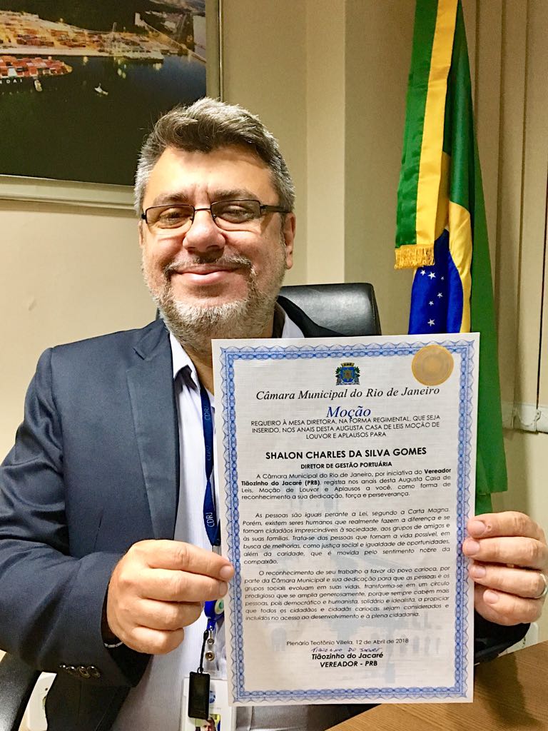 O Diretor de Gestão Portuária da Companhia Docas do Rio de Janeiro, Shalon Charles, recebeu no último dia 13 de abril a Moção da Câmara Municipal do Rio de Janeiro. A Moção foi oferecida como forma de reconhecimento pelo seu trabalho, dedicação, força e perseverança.
