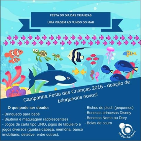 O Instituto Nacional do Câncer realizará, em outubro, a tradicional Festa em comemoração ao Dia das Crianças. E para a festa ficar ainda melhor o INCAvoluntário está mobilizado em uma grande campanha de arrecadação de brinquedos novos que serão entregues aos pacientes infanto-juvenis em tratamento.