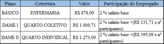 Os Planos, suas coberturas, seus valores e as respectivas fórmulas de cálculos da participação do empregado, para desconto em folha de pagamento, constam no quadro abaixo: