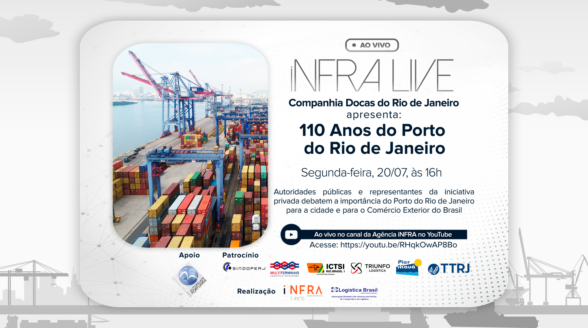 Para celebrar os 110 anos de história do Porto do Rio de Janeiro, a Companhia Docas do Rio de Janeiro (CDRJ) realizará um evento digital especial no dia do aniversário do porto (20 de julho), às 16 horas. O webinar, que será transmitido ao vivo pelo canal do Youtube da Agência Infra, contará com a participação de autoridades públicas e representantes de entidades e empresas no debate sobre o porto e sua importância para a cidade e o comércio exterior do Brasil.